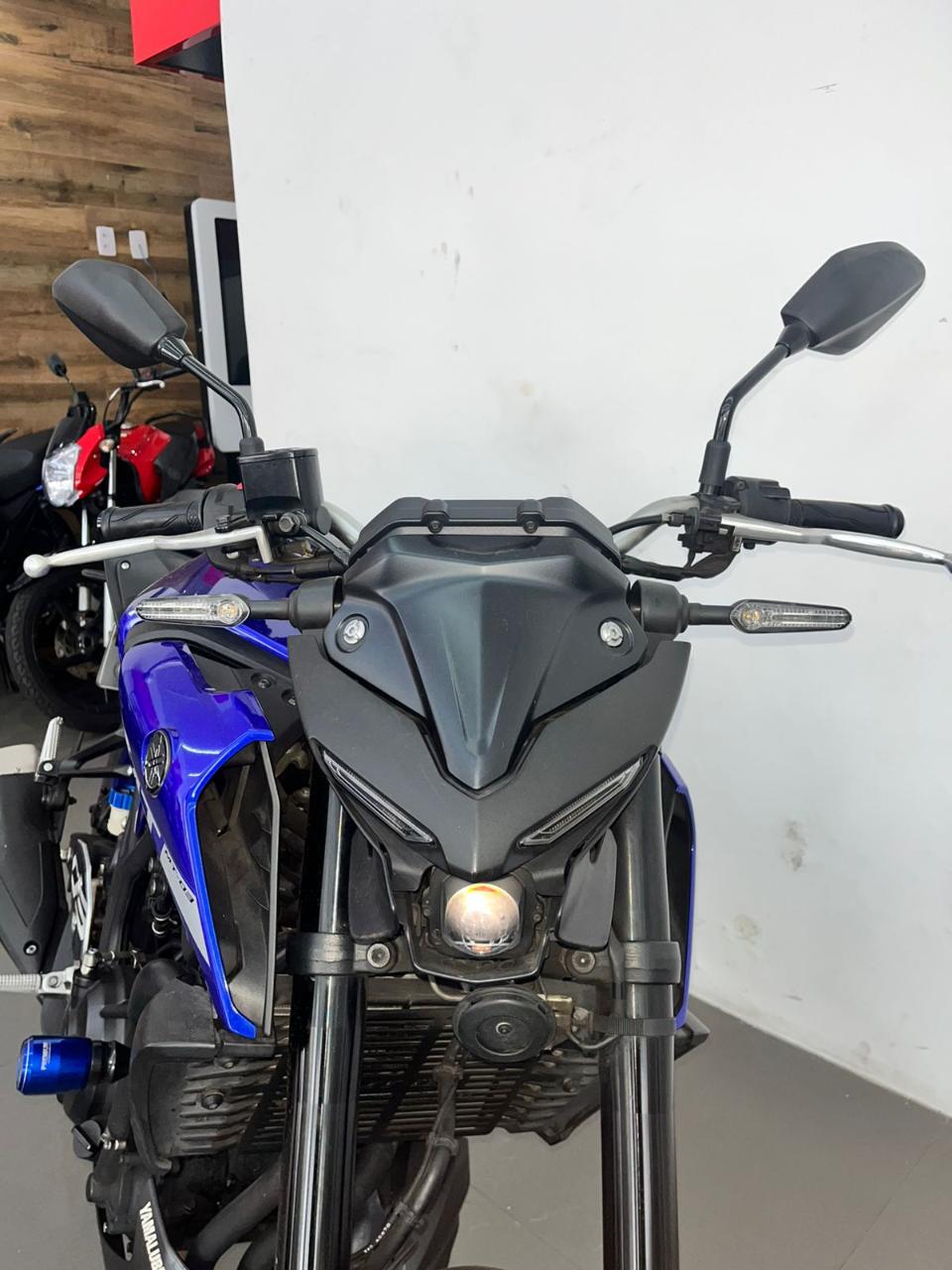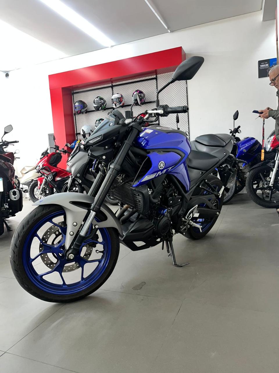 A ficha técnica da Yamaha MT-03 2022 inclui motor bicilíndrico de 321 cc, 41,3 cv de potência, 3,0 kgf.m de torque, câmbio de 6 velocidades e freios ABS nas duas rodas. Possui suspensão dianteira invertida, painel digital, farol em LED, iluminação DRL full LED e tanque de 14,2 litros.
